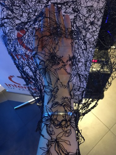 Floral shapes of black FLEXY plastic webbed over nude tulle mimic the hand-embroidery you could easily find at any Paris Fashion Week haute couture show. But these creations are actually a product of tech and fashion. Israeli textile designer Eden Saadon used 3D printer pen 3Doodler to create a form of “fashion art” that wowed the “Internet of Fashion” MeetUp group who met at the 5th Ave Microsoft store.